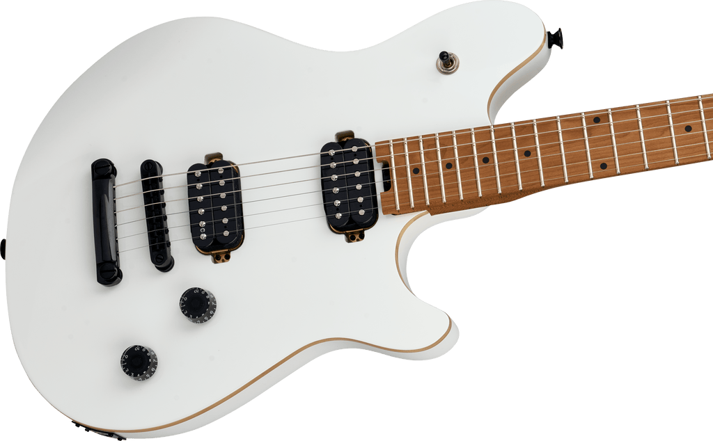 Dual EVH® Wolfgang humbucking pickups mounted directly to the body increase vibration transfer, resulting in sustain for days on end. The black speed tone and volume control knobs have been have been dialed-in to Van Halen's exacting specifications - the smooth-feeling 500k pots make it easy to find a unique sound while retaining the crisp high-end sparkle of the Wolfgang pickups. Now featuring a fixed bridge and stoptail bar!