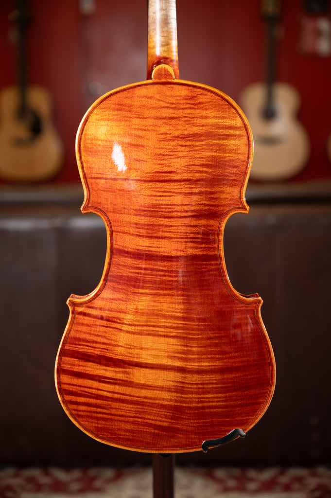 Hand-Carved, Solid Straight-grained Spruce top; Hand-Carved, Solid Flamed Maple Back, Ribs, Neck and Scroll; Wittner Fine-Tune pegs, Ebony Fingerboard and Chin Rest; Seasoned Maple Bridge; Ebony Tailpiece with E Tuner; Hidersine Synthetic Core Strings.